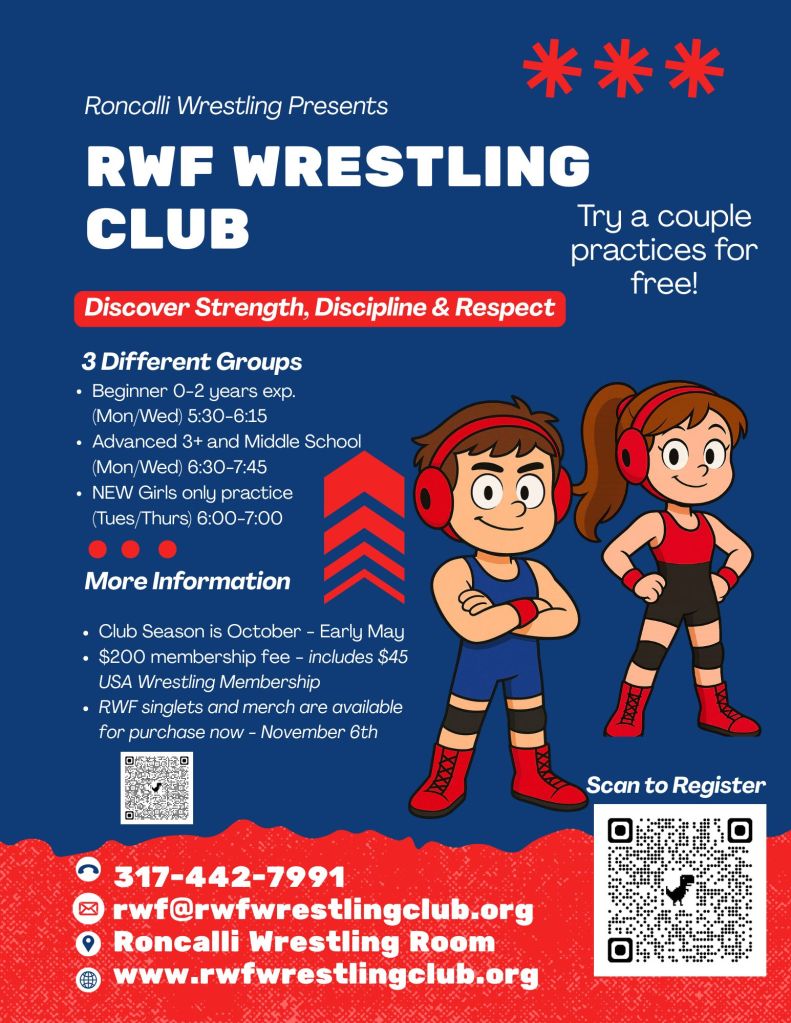Check back here often for info about all things Roncalli Wrestling and RWF Wrestling Club. Have questions? Reach out to wresting@roncalli.org or rwf@rwfwrestlingclub.org RWF club is for all our wrestlers pre-k – graduates. All our Roncalli Wrestlers are in RWF.