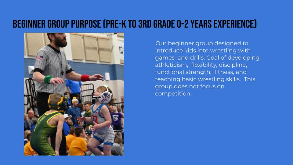 Beginner Group – This group is for younger wrestlers with 0-2 years of experience. This group is for pre-k to about 3rd grade. We do make exceptions if kids are young but ready to move up.