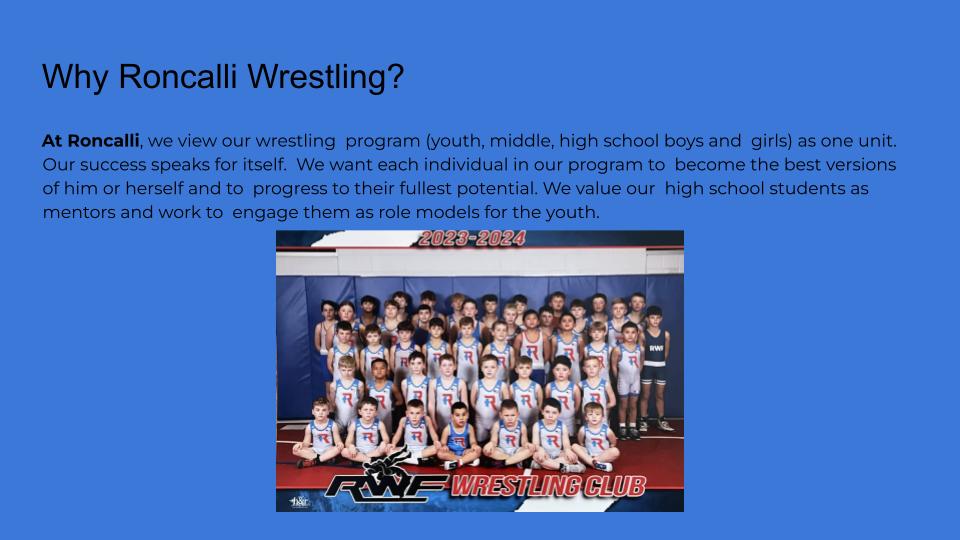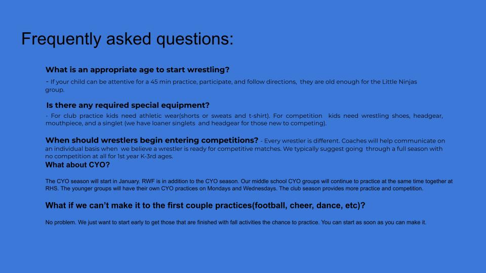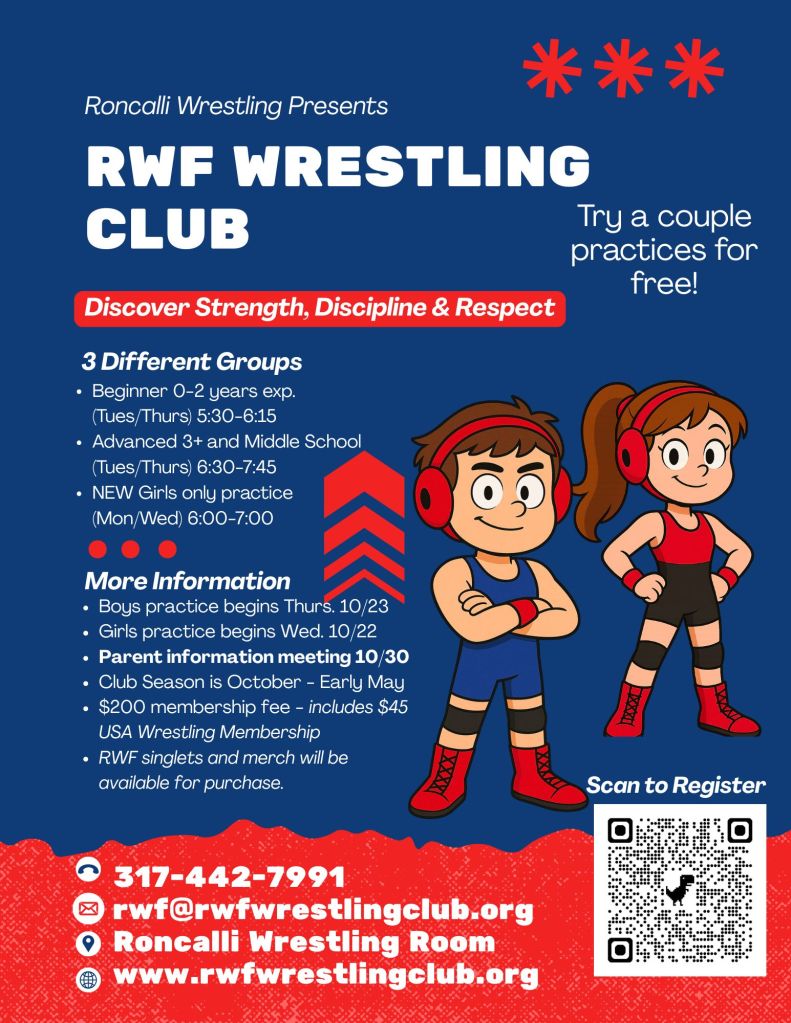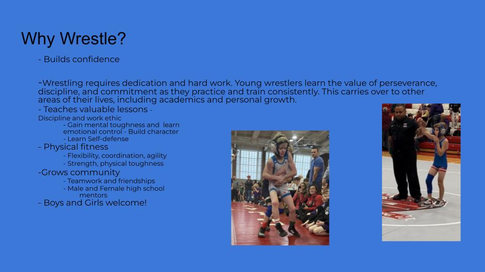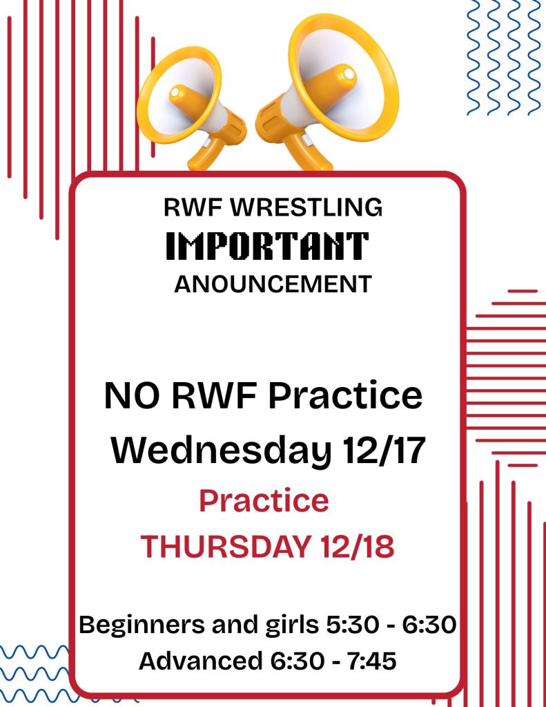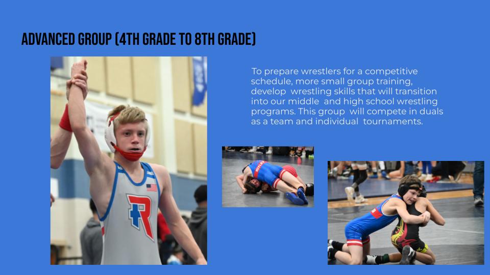 We will have RWF Youth practices 2 days a week. We will have elementary club tournament season November – January (Elementary Team State is the End of Elementary Team State.). Elementary Wrestlers not on the team will have opportunities for beginners tournaments and exhibition matches.